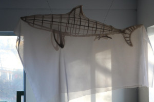Models, drawings and full scale version of a shark sculpture. The work consists of two sharks, one covered in a black veil, one covered in a white veil. They will be suspended and floating in space with a long veil that trails below them.